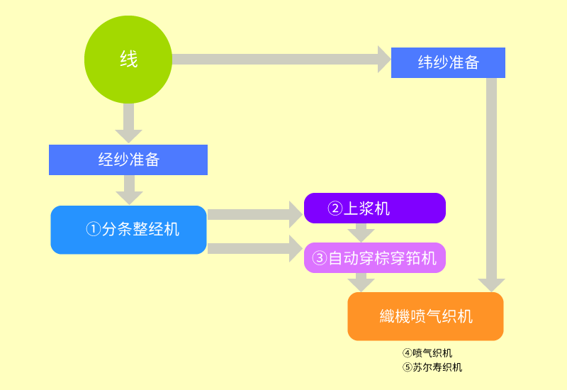 根据面料规格,把必要的经线被分成几批,在滚筒上缠绕成片状,修剪,然后缠绕到经轴上。